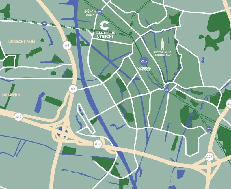 Cartesius ligt tegen de historische binnenstad van Utrecht aan. Je bent op de fiets in 8 minuten op het Centraal Station en via het naastgelegen station Utrecht Zuilen brengt de trein je er in 3 minuten naartoe. Om de historische binnenstad in te gaan of verder te reizen. Zo is Cartesius echt onderdeel van het centrum van Utrecht. Met de auto ben je ook zo de stad weer uit. In 7 minuten zit je op de A2 en in 9 minuten op de A27 of A28.